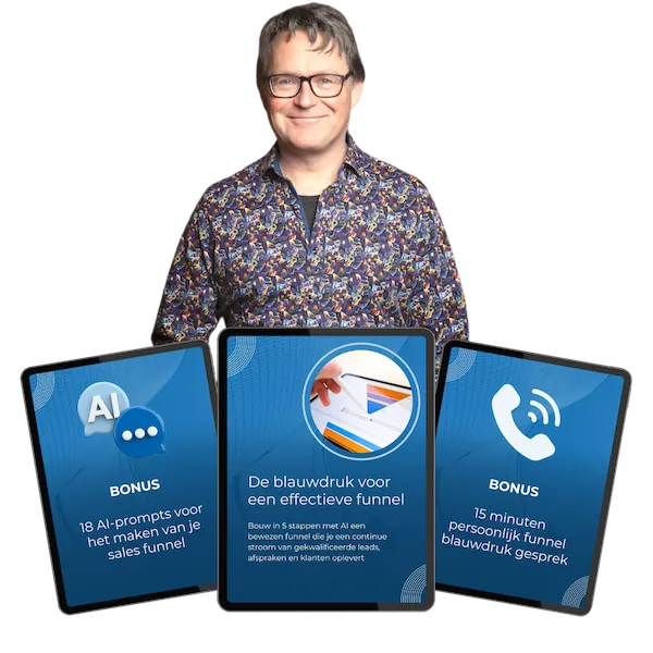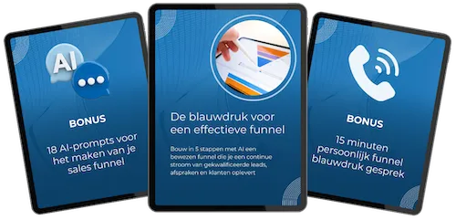 Download dan mijn gratis blauwdruk voor een effectieve funnel. Daarmee bouw je in 5 stappen met AI een slimme sales funnel die 24/7 gekwalificeerde leads en afspraken oplevert.